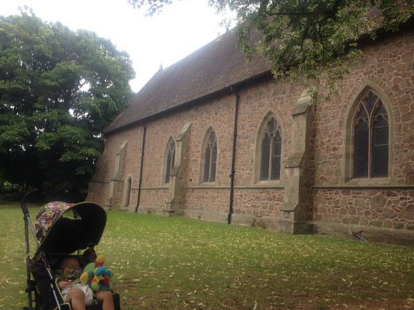 趁著等車年度檢查時去附近教堂走走,他在推車上還蠻好睡的。