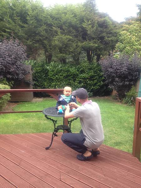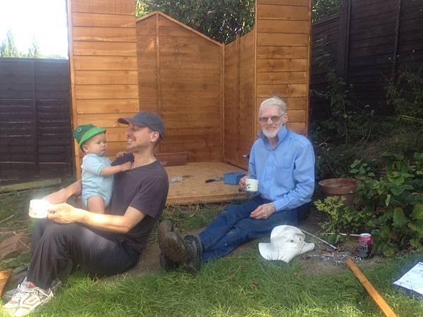 這是鄰居Bruce 來幫我們搭建新的花園工具房,Alfie 正在探班。
