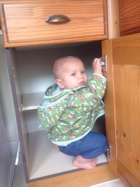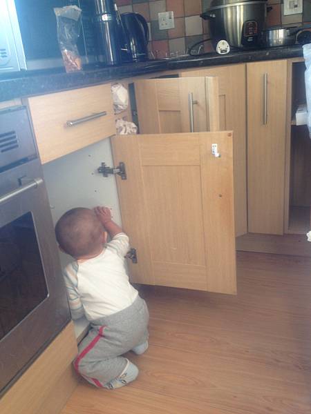 到了新家一樣先跟空空的櫃子打招呼。