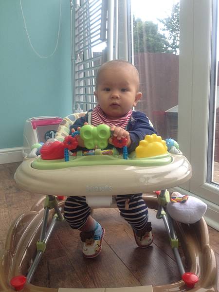 在朋友家坐學步車。
