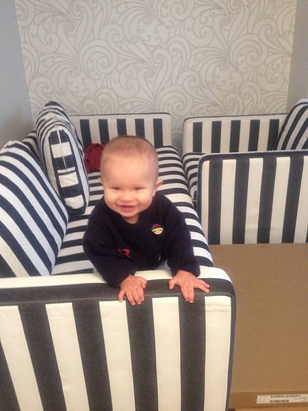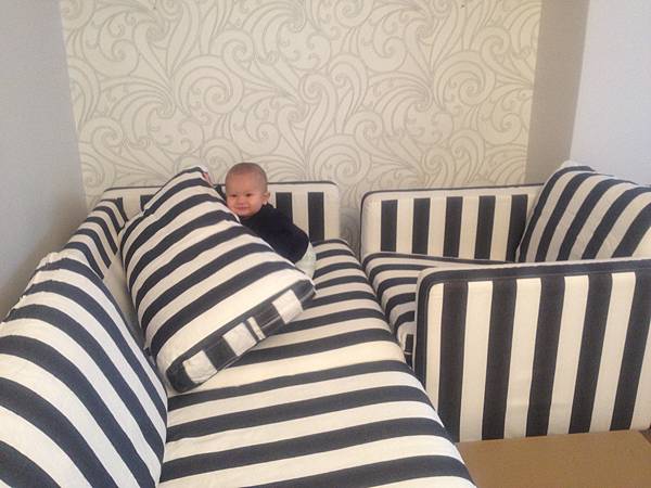 換了新沙發(二手店買的),Alfie 很喜歡在上面玩耍、推枕頭。